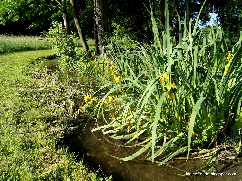 Blühende Sumpf-Schwertlilie (Iris) an einem kleinen Bachlauf. Das leuchtende Gelb passt zu diesem schönen, warmen und sonnigen Wochenende.