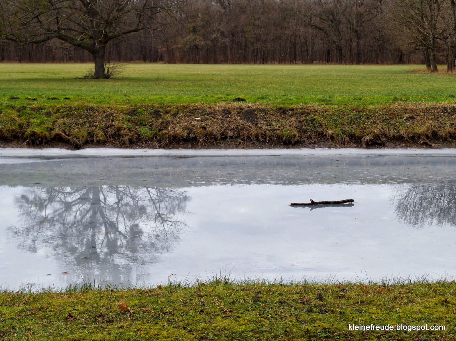 Recht frostig ging das alte Jahr zu Ende. Mit Beginn des neuen Jahres setzt Tauwetter ein und auf der dünnen Eisschicht steht Wasser. Da es in den nächsten Tagen eher mild bleiben soll, war dem Eis am Schlossteich ein kurzes Dasein beschert...